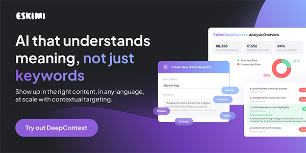 Eskimi’s DeepContext tool has all four of these capabilities. It starts with a Brand Blueprint. This is a custom framework that outlines tone, sensitivities and desired associations. The Relevance Engine then scans live web content, continuously learning which environments best align with that blueprint. This custom approach can be activated on any DSP.